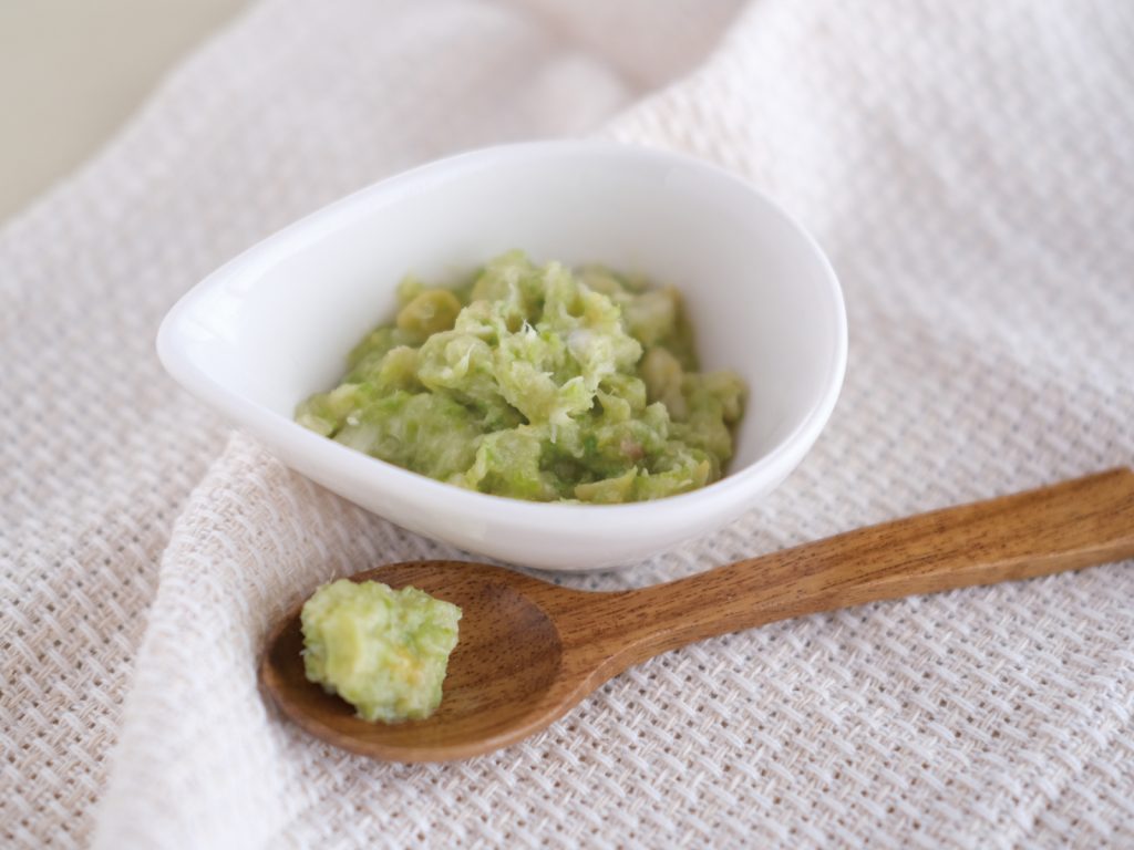 グリンピースは柔らかく茹でて薄皮をとり、ゆで汁を適宜加えすり潰します。