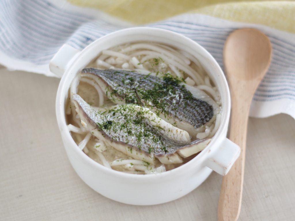 一食で糖質、蛋白質が摂れるよう焼いた魚を乗せたうどんにしました。