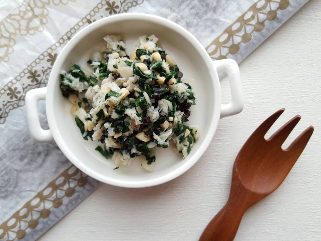 2.ほぐした魚とほうれん草をくわえて混ぜれば、出来上がり♪