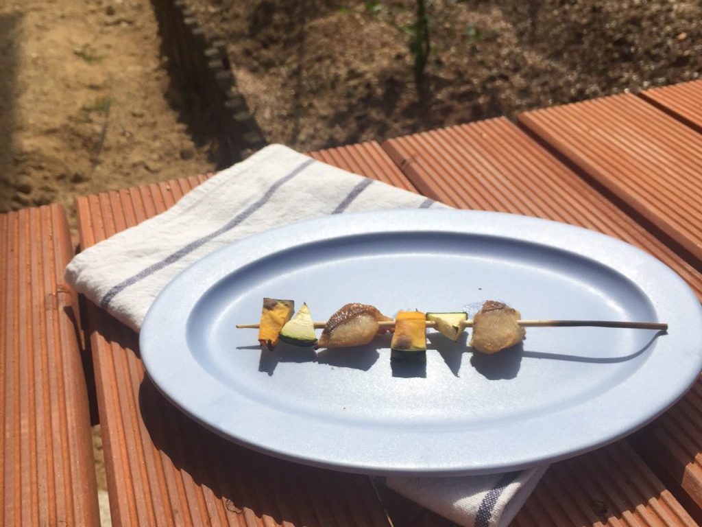 1.魚、ズッキーニ、かぼちゃ全て半分に切ります。竹串に順番に刺していき、魚焼きグリルで弱火で10分ほど焼いて完成です。