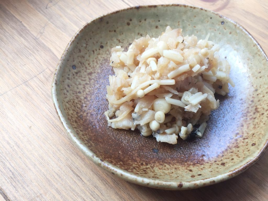 1.小鍋に出汁、細かく切ったえのきを入れて弱火で7分ほど煮ます。ほぐした魚と醤油も加えて、さらに2分ほど温めとろっとしたら完成です。